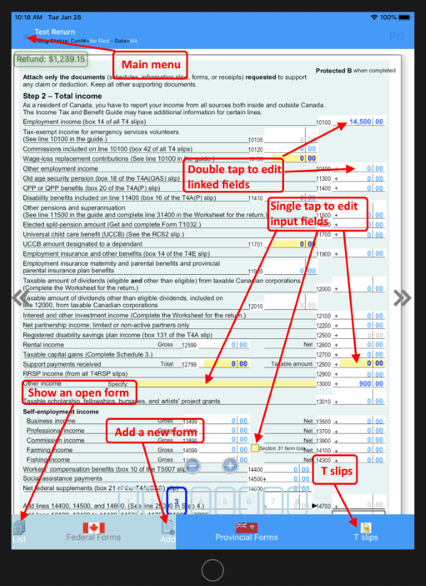 The following picture shows the first screen you get when you open or create a new return. It presents the main StudioTax features and how you can access them. The iOS version provide the same navigation and edit functions as the Mac or Windows versions. The access to those functions is enabled using a native iOS user interface/interaction.